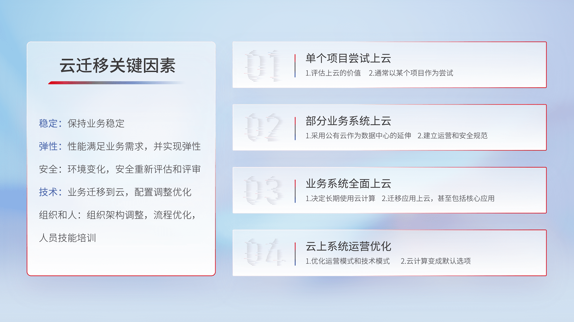 结合实际业务,,,从规划设计、、、、云平台选型、、、、云原生改造、、数据迁移、、集成交付,,,,迁移全过程为客户识别最佳上云路径,,做好风险识别管理,,,设计网络架构、、、身份权限、、安全审计合规、、、、操作审计、、、、日志审计、、监控告警策略、、多站点容灾设计等,,对云上基础设施进行整体规划,,,提升IT治理水平,,,,以满足弹性、、高可用、、高性能的需求。。