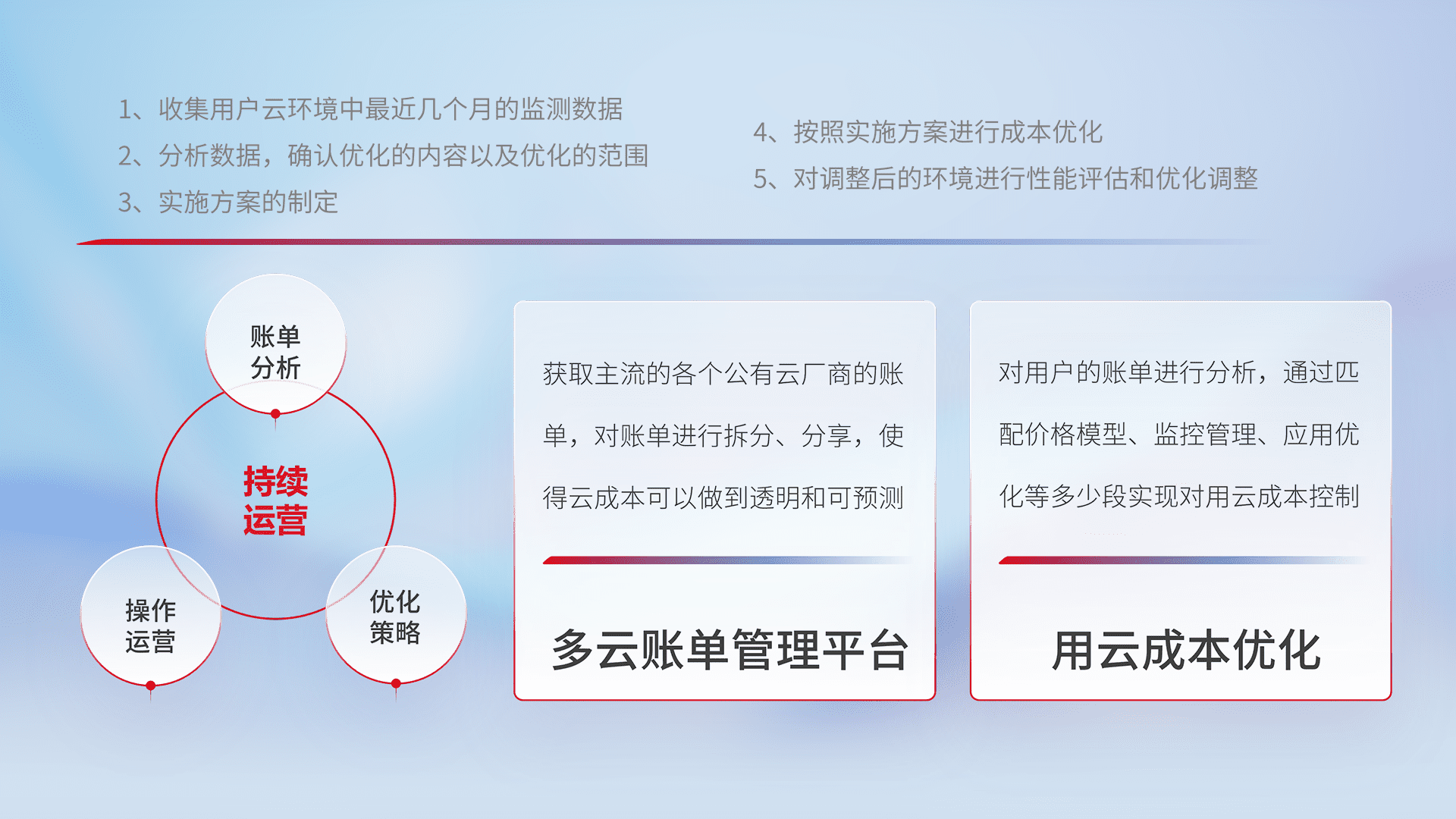 通过多云纳管,,,,以统一的资源数据模型把客户的云资源进行抽象和封装,,,进而实现对多云资源的统一操作,,,,保障云资源管理的可靠性、、稳定性与可用性。。。量身定制化运维内容,,,,配置、、、开发运维、、、补丁管理、、、、备份、、、、监控、、认证和访问管理、、审计和日常巡检等,,,保障在用云过程中的可靠度,,,稳定度以及高可用率。。。